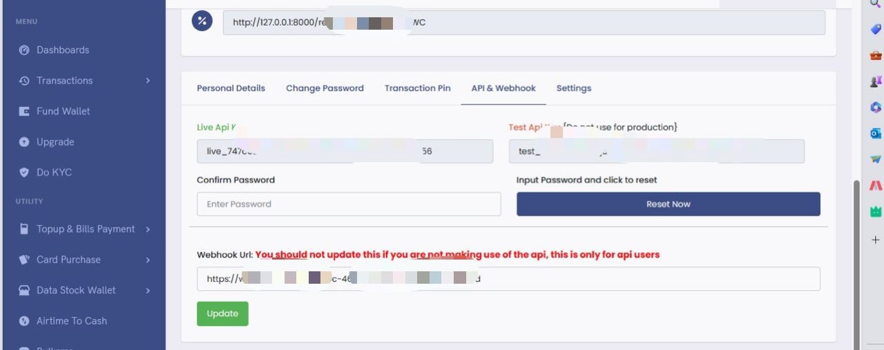 In other to take advantage of webhooks, you will have to first set up a publicly available URL that TaliBpay can have access to. To set up one, kindly go to your dashboard, click on the Account Settings link and check under the API & Webhook tabs, there, you will find an input box for your webhook.